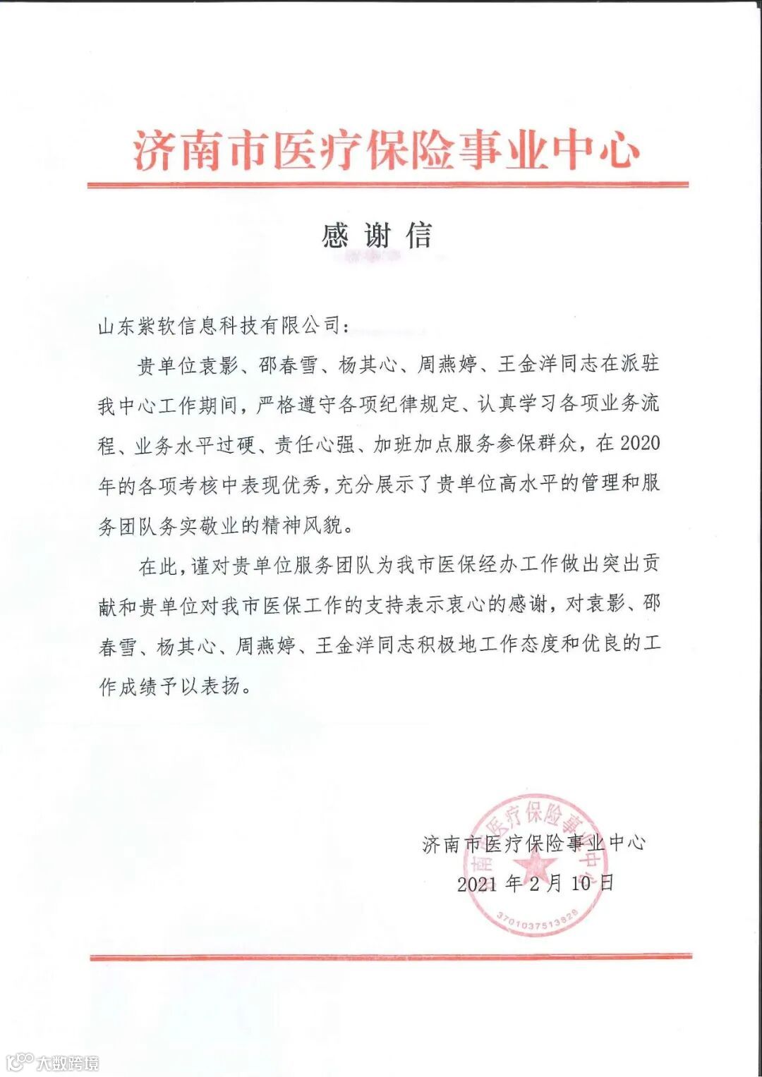 2021年新年伊始之际,山东紫软信息科技有限公司就收到了一封来自济南市医疗保险事业中心的表扬信。在信中,济南医保事业中心对紫软科技在2020年度档案服务项目中的工作给予了高度评价;对项目期间一线员工(袁影、邵春雪、杨其心、周燕婷、王金洋)勇于担当、甘于奉献的实干精神和认真负责的服务态度给予了高度赞扬。