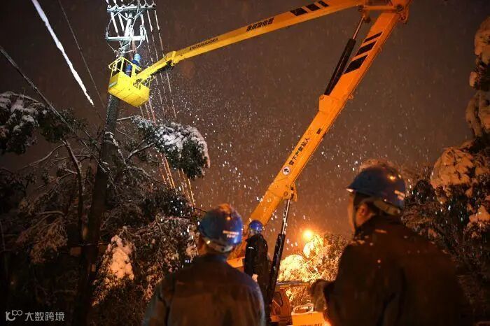 18点,电力工人正在抓紧抢修电力设备。他们爬上电线杆的背影,是停电小区的希望。