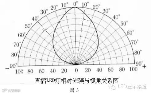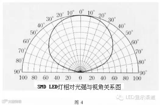 比较图4和图5可以看出,SMD灯的水平视角明显优于直插灯的视角(垂直视角与之类似),当然不同型号的灯该图是有差异的,但SMD灯的视角优于直插灯则是不争的事实。一般来说,SMD显示屏的视角可达110度左右,而直插灯显示屏视角可达90度左右。
