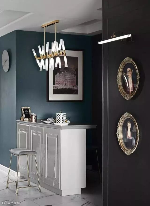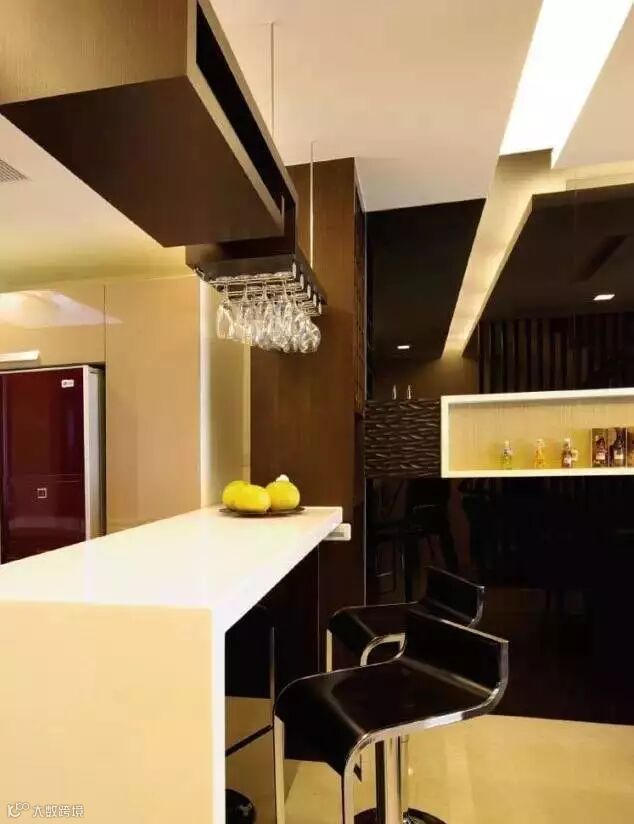 你还可以拥有一个家庭转角吧台?当然啦,只要转角空间的横向面积够大,完全可以在墙上加一面隔档,放几只酒杯,做一个吧台。不仅如此,还有储物、装饰的功能。转角的墙如果不是承重墙,可以考虑将吧台上方的一部分墙拆掉,留一些空间,看上去比较通透、有设计感。但要注意的是台面的转角最好弄成圆角,不然很容易撞到受伤。