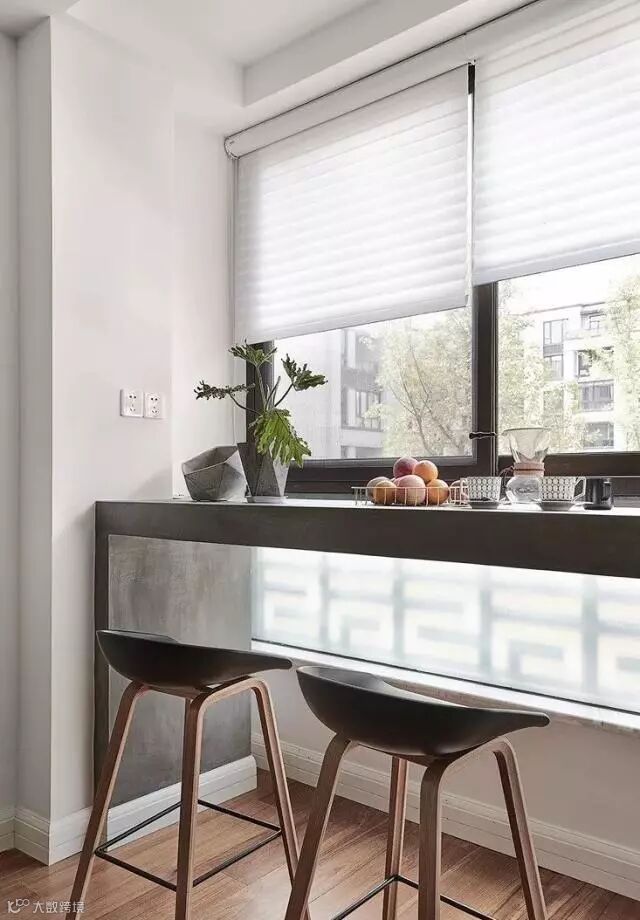 有时闲来无事喜欢看看窗外的风景和过往的人,可是家里又没有飘窗,那么这时正好在窗边加一个隔档,就是一个吧台了。这样,家里又多了一个充满着闲情逸致的小角落。可以选用单片的木板直接按在窗台边,也可以做一个宽度大的柜子,下面放书,上面当做吧台喝咖啡。甚至可以尝试在板下安装大一点的合页,不用的时候还能收起来放。