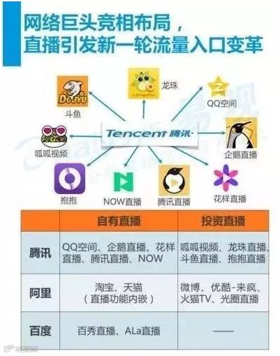 BAT巨头对直播的青睐也可见一斑,其中腾讯的布局堪称疯狂,涵盖游戏、体育、泛娱乐等多个层面,自有的直播业务包括QQ空间、企鹅直播、花样直播、腾讯直播、NOW,投资的直播平台包括呱呱直播、斗鱼直播、龙珠直播等。