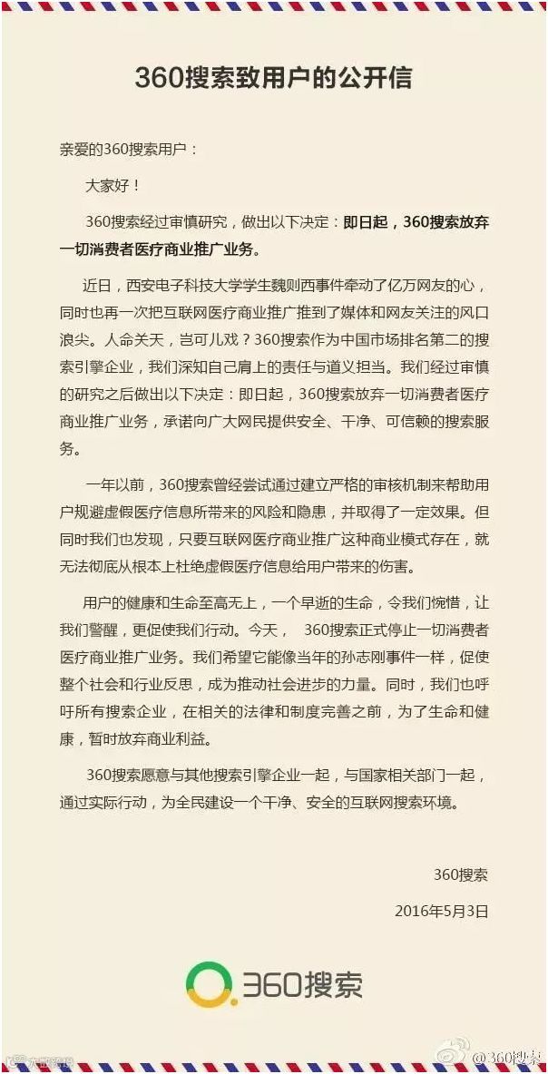 魏则西事件发生后,百度发布了一封来自百度内部信《砥砺风雨坚守使命》,诉说自己的这份“委屈”。也正在这时,一向天不怕地不怕的“红衣教 主”周鸿祎又给一个神补刀,发文“我们决定彻底清除医疗商业推广!”