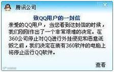 2010年11月3日傍晚6点,,腾讯公开信宣称,将在装有360软件的电脑上停止运行QQ软件,倡导必须卸载360软件才可登陆QQ,这是360与腾讯一系列争执中,腾讯方面迄今为止最激烈的行动。此举引发了业界震动,网友愤怒,业内认为,腾讯这招是逼迫用户作出二选一的选择。据360CEO周鸿祎称被迫卸载的360软件用户达到6000万。