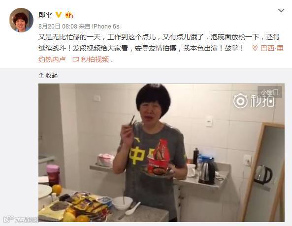 女排教练郎平老师奥运期间开个小灶,晚上泡上一碗经典的康师傅红烧牛肉面来填填肚子。