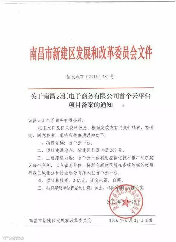 2016年6月29日,南昌云汇电子商务有限公司首个云平台项目获得南昌市新建区发展和改革委员会备案,这是首个云平台在各地发展、推广获得政府认可的资本,是各地不断努力的结果。