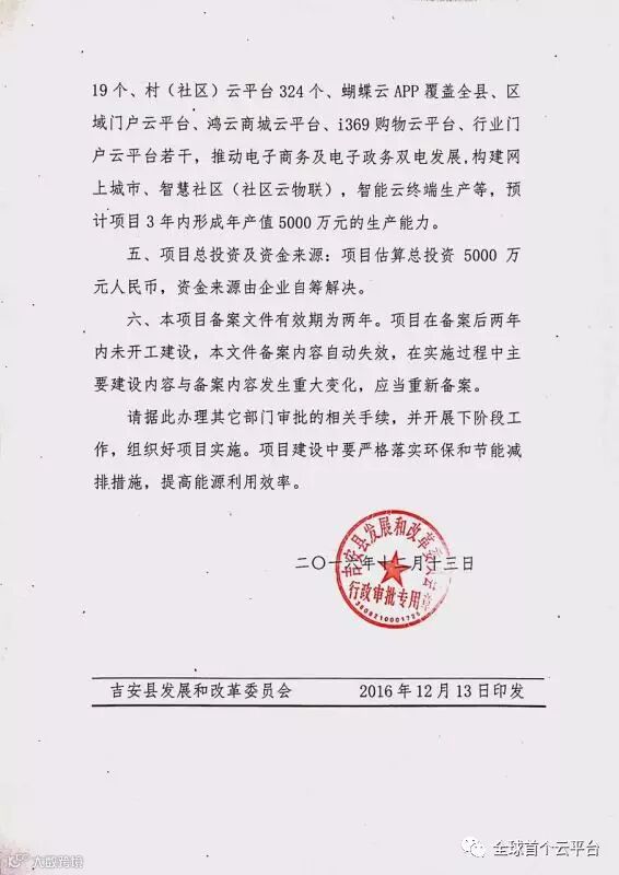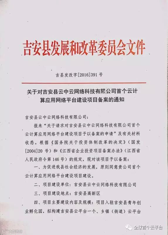 12月13日江西省吉安市吉安县发改委确认为吉安县云中云网络科技有限公司所申请的“首个云计算应用网络平台”项目进行备案,并发布相关文件。这是首个云平台项目在全国市场推进中取得的又一个政府的肯定和认可,是我们携手走向成功的又一个重要节点,这再次说明我们的项目是适应国家发展纲要和时代需要的优质项目。