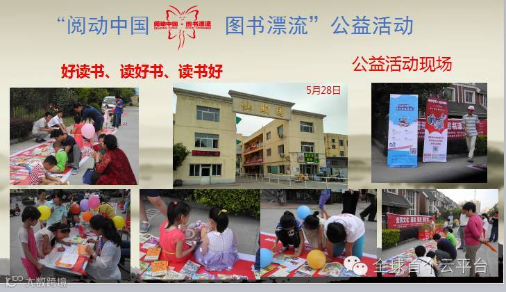 目前此公益活动从5月28日开始,已经持续了一个多月, 公益志愿者利用星期六、星期天双休时间到小区进行活动,受到小区居民的热烈响应,每天都有捐书的大人和小孩,每天都有现场阅读的儿童和成人,还有免费借阅的。 为了彰显爱心,从小培养儿童的荣誉感,志愿者让捐书的儿童在横幅上签字并拍照,再上传到公益网站上。一些有爱心的企业也纷纷参与,有捐书的、有出钱的、有出力的、有出服务的。在民政局领导的支持下,还进入了两个农村社区进行了公益活动,同样受到了农村社区居民的欢迎和积极响应。