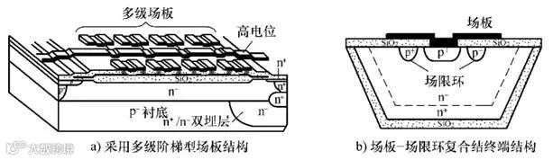 结终端结构有场板(如斜场板、多级场板、金属场板、电阻场板及浮空场板等)、场限环及横向变掺杂技术。还可采用降低表面电场(RESURF)技术与衬底结终端技术。图10a所示为常用的多级浮置场板(MFFP)结构,其中采用了n-n+双埋层以实现与衬底之间的高压隔离。图10b所示为采用介质隔离的场板-场限环复合结终端结构,在主结和场限环上方均覆盖有场板。此外,沟槽型(或截断型)结终端结构,占用的表面积较小,非常适合PIC中的横向高压器件使用。