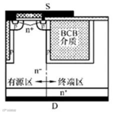 图4所示的截断型结终端结构是针对沟槽回填法形成超结器件设计的。在n-外延层上先刻蚀好沟槽,再利用LPCVD在槽内淀积一层重掺杂硼的多晶硅后进行高温扩散,于是在沟槽侧壁处形成了p柱区;最后在沟槽中填充低介电常数、高临界击穿电场强度的苯并环丁烯(BCB)介质。终端的p区与有源区的p柱区同时形成,并且硼剂量可以精确控制,只是有源区的槽宽为5μm,结终端区沟槽宽约为70μm。此外,源极金属延伸到终端区深槽上方会形成场板。仿真结果显示,采用该结终端结构可以实现1300V以上的体击穿电压。