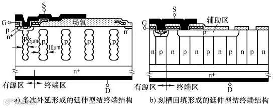 超结通常采用多次外延与刻槽回填工艺形成,因此超结器件的终端也可以分为延伸型与截断型。