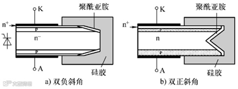 低压晶闸管常用正负斜角结终端;超高压晶闸管常用双正斜角或双负斜角结终端。对于焊接式晶闸管,由于采用烧结工艺形成阳极接触,在阳极欧姆接触形成后,采用磨角工艺形成正负斜角,工艺简单,成品率较高。对于压接式晶闸管,由于芯片两侧的电极是通过蒸铝形成的,因而常用双正斜角或双负斜角。管芯磨角后,经腐蚀去除掉表面的机械损伤层,然后用很薄的聚酰亚胺膜钝化腐蚀过的斜面,最后外面涂覆硅胶进行保护。