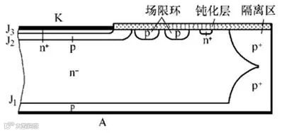 具有正、反向阻断能力的方芯晶闸管可采用图6所示场限环结构。上面的J2结外侧设置了场限环和沟道截止环,下面的J1结与p深扩散区连通,相当于结终端延伸。可以在连通的p扩散区进行划片。