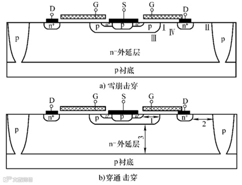 雪崩击穿类型有四种:沟道结表面雪崩击穿I、 隔离结表面雪崩击穿Ⅱ、沟道扩散区弯曲处雪崩击穿Ⅲ 及栅极覆盖引起的n-n+结的雪崩击穿Ⅳ,如图9a。可采用场板或场限环结构,也可采用RESURF技术,使击穿点转移到体内;为了降低沟道pn结弯曲处的电场强度,可加大p阱区或n+漏区的结深(>4~5μm),以减小pn结或nn+结的曲率,同时增加栅极与n+漏区的距离,使得栅极不要终止在n+漏区表面,避免n-n+结的雪崩击穿。