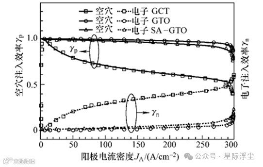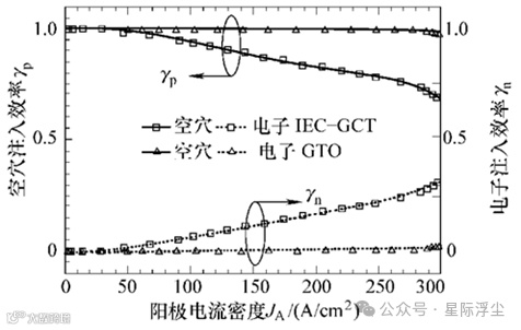 图11当JA<40A/cm2,GTO和IEC-GCT的γp都很高,且γp→1。当JA>40A/cm2时,GTO的γp几乎保持不变,而IEC-GCT的γp随JA增大而下降,同时γn随JA增大而增大。通过优化阳极的掺杂浓度和介质层覆盖在阳极区的宽度,可以获得与透明阳极相似的注入效率。