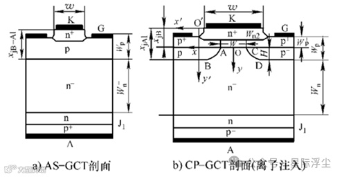AS-GCT是p+nn-pn+五层非对称晶闸管结构,其p+阳极区是一个浅的中等掺杂区,由于电子很容易穿过,故称为透明阳极。