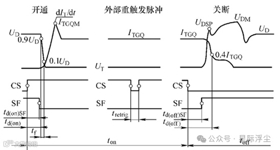 开通延迟时间td(on):从接收到开通命令开始,到阳极电压从稳态值UD下降到0.1UD所经历的时间,一般为3.5μs。
