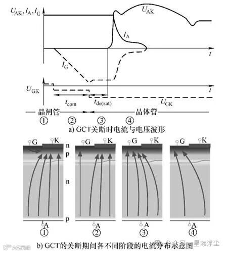 图6 GCT关断时电流与电压波形及各阶段的电流分布