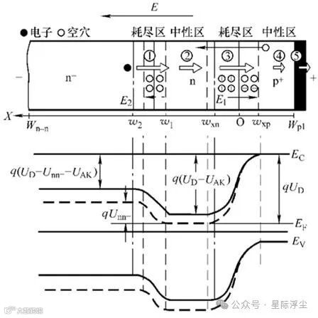 图7 p+nn-结构的电荷输运及其能带示意图
