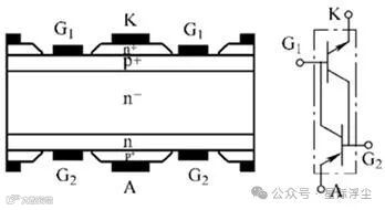 以n-基区为中心的上下对称结构,有两个门极。五层的p+nn-pn+结构是由两个不同基区的双晶体管组成,其中p+nn-p 为宽基区晶体管,n+pn-n为窄基区晶体管。上表面有阴极K与开通门极G1,下表面有阳极A与关断门极G2。采用双门极有利于提高器件的关断速度和工作温度。与单门极GCT相比,关断损耗可降低70%,6kV时工作结温可高达160℃。它适用于高电压、大电流和高频率的场合。