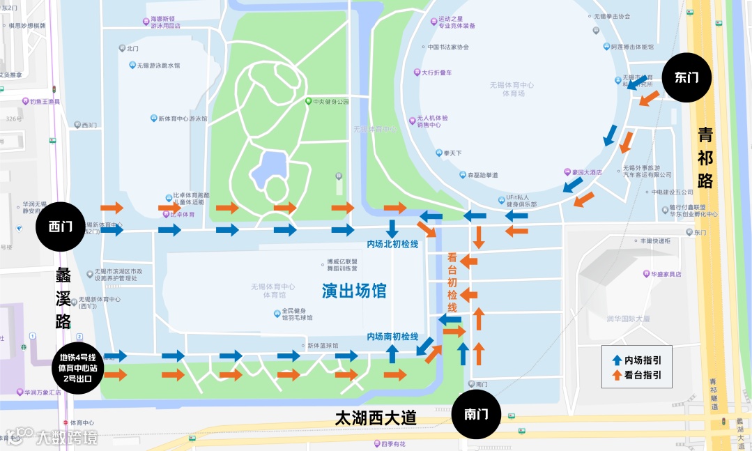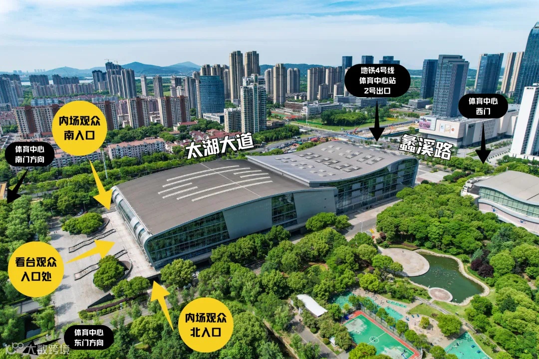 东门(青祁路入口)、南门(太湖大道入口)、西2门(蠡溪路入口)、地铁4号线2号出口,请跟随现场引导入场。