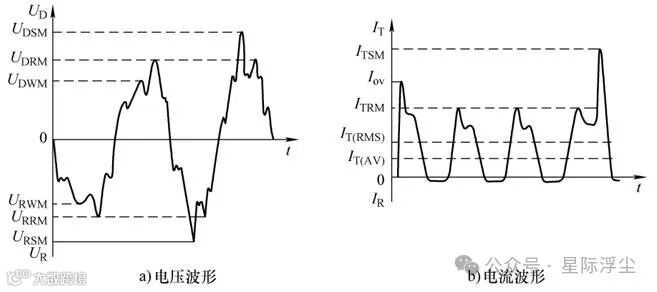 图6是晶闸管的电压与电流波形及其参数示意图。晶闸管正常工作时,要求其阳-阴极间的电压值处于正、反向工作峰值电压之间。图6b中的ITRM为通态重复峰值电流,Iov为过载电流,IT(RMS)为通态方均根电流。
