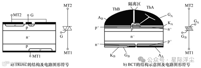 (3)双向晶闸管:双向可控制导通和关断。广泛应用于静止无功补偿器(SVC)、工业传动装置、变压器调压器及软起动器等中。