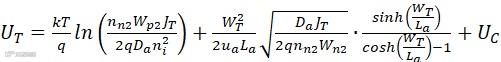 式中,WT为耐压层(包括n1基区、p2基区及p1阳极区)的总厚度;Wp2为p2基区的厚度;nn2为n2阴极区的掺杂浓度;ni为本征载流子浓度;La为载流子的双极扩散长度;μa为双极迁移率;Da为双极扩散系数;JT为通态电流密度。