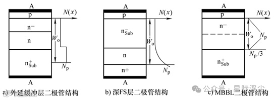 图3c是一种中部高浓度的宽缓冲层(Middle Broad Buffer Layer,MBBL)二极管结构,它是利用外延工艺在n-区形成一个中心处浓度为Np,两侧浓度约为1/3Np的类“山”形掺杂浓度分布。这种较宽的“山”形掺杂浓度分布,也可在FZ硅单晶片上利用P或As离子注入来实现。采用 MBBL 结构可以获得快而软的反向恢复特性,并抑制反向高电压的振荡。将MBBL结构与质子辐照技术结合,可进一步降低反向峰值电流抑制高压振荡。
