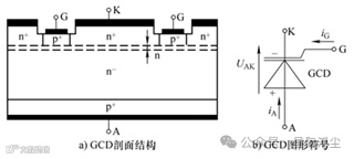 除了对快恢复二极管的n缓冲区、阳极区及阴极区进行优化设计外,还可以在阴极侧增加一个控制极,形成门极控制二极管(Gate Controlled Diode,GCD)。如图4所示,它是利用台面工艺将p+门极区从n+阴极区中分离,并形成独立的门极接触。