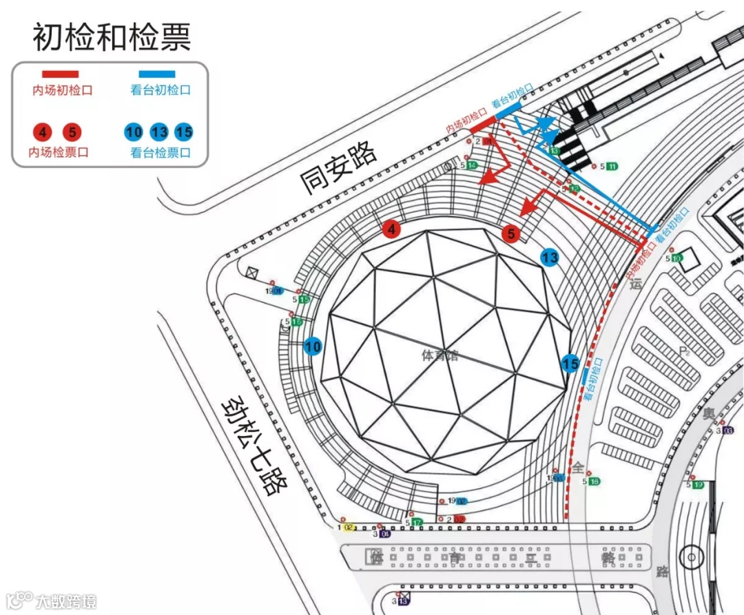 由看台10/13/15检票口安检后,进行验票,至体育馆内,按对应区号直达座位区。