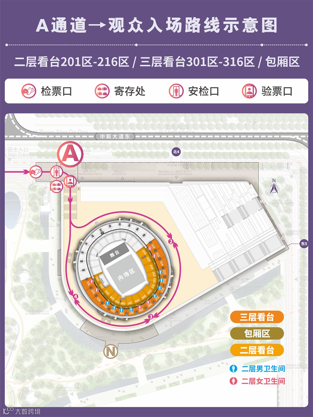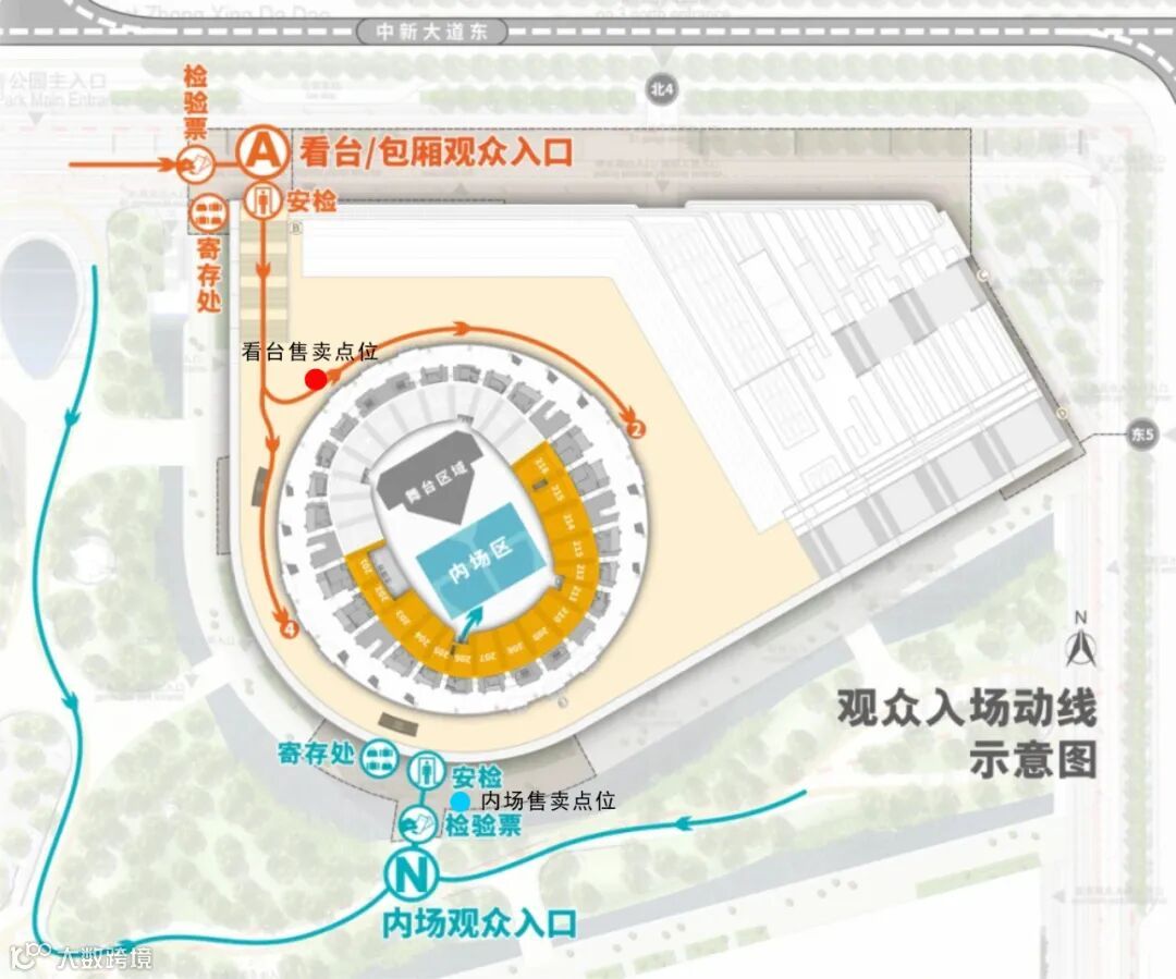 由体育馆A口通道进行检票、寄存、安检、验票后,上行至体育馆平台,至座位区。