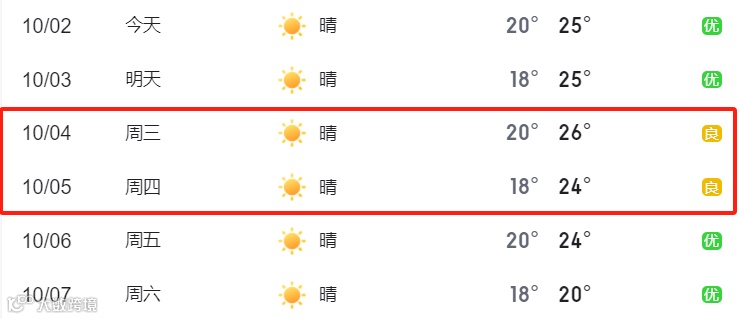 据气象台发布的天气预报显示10月4日、5日☀晴天,夜间温度舒适,可按个人习惯增减衣物,以免着凉。