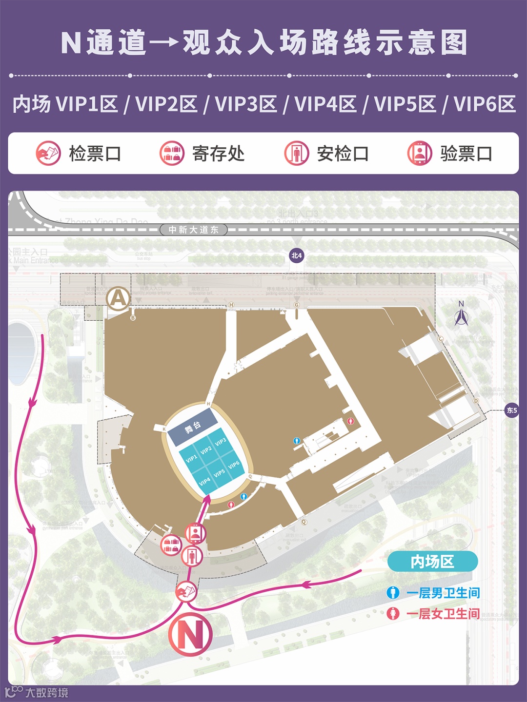 由体育馆N口通道进行检票、寄存、安检、验票后,进入体育馆内场座位区。