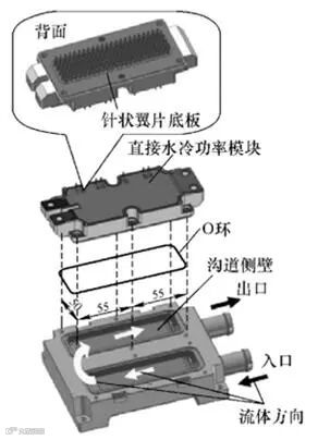 为了改善功率模块的散热性能,将带有针状翼片底板的模块,直接安装在具有O环冷却通道开口的水冷散热器上。在散热器与通道侧壁之间有一个很小缝隙,其中的流体在维持高热传输时有利于减小压力的损失。采用水冷散热器,彻底解决了模块底板与散热器之间的热膨胀系数不匹配而引起的热性能及可靠性差等问题,并且能显著减小 模块的体积,非常适合电动汽车使用。