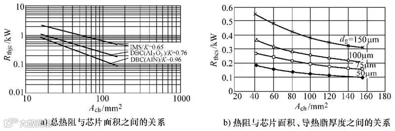 高热导率的基片热阻随芯片面积的增加而大致呈线性关系(比例系数K=0.96)。但当热导率较低时,热阻与面积的关系会呈非线性变化。这是因为芯片与散热器之间导热脂的热阻Rthcs随芯片面积的增加而增大。