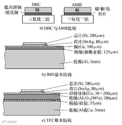 基板材料:金属基板和厚膜铜(Thick Film Copper,TFC)基板,其中金属基板又包括直接覆铜(DBC)基板、活性金属钎焊(Active Metal Brazing,AMB)基板、绝缘金属基板 (Insulated Metal Substrate,IMS)及多层绝缘金属(Multilayer-IMS)基板。