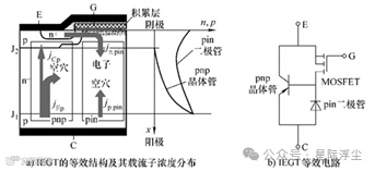 IGBT可等效为MOSFET和pnp晶体管的级联,在导通状态下,IGBT可简化地等效为MOSFET和pin二极管的串联。
