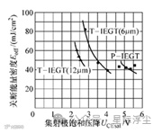 图13所示为采用局部少子寿命控制的P-IEGT与T-IEGT关断能耗密度与饱和电压 UCEsat的关系。P-IEGT的UCEsat明显比T-IEGT的要高,并且沟槽越深,对改善T-IEGT关断特性与饱和电压越有利。