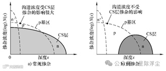 若采用常规掺杂工艺,由于存在杂质的补偿作用,会使沟道的净掺杂浓度降低,导致阈值电压下降,并影响沟道电子的迁移率,同时也很难形成掺杂浓度和厚度均合适的n辅助层。采用倒掺杂(Retro Grade Doping)工艺,可有效避免CS层对沟道掺杂浓度的补偿,有利于获得更高的沟道电子迁移率,并提高器件的均匀性,增大短路安全工作区(SCSOA)。