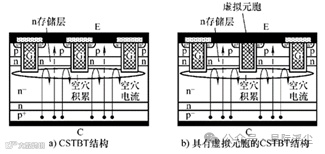 CSTBT结构是在p基区与n-漂移区之间增加一个n载流子存储(CS)层, 类似于HiGT结构中的n HB层。导通期间在n CS层下方会形成空穴积累层。如将n CS层和虚拟元胞相结合,可形成CSTBT结构,导通期间的IE效应会更强,从而获得更低的导通损耗和开关损耗。