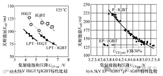采用LPT型耐压结构可进一步改善平面栅IE-IGBT的综合特性。图14a对4.5kV器件而言,当关断能量Eoff一定时,LPT-HiGT的饱和电压更低,而普通IGBT特性最差。图14b对6.5kV器件而言,当Eoff一定时,EP-IGBT的UCEsat比普通IGBT低30%。如果将沟槽栅n辅助层及LPT型结构相结合,可以获得更好的综合特性。如LPT-CSTBT结构的饱和电压比传统P-IGBT结构的下降约40%,并且耐压越高,CSTBT与传统P-IGBT结构的特性差异越大。