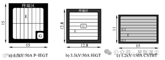 图5a为东芝公司4.5kV P-IEGT芯片,尺寸为15mm×15mm,栅极压焊点均位于芯片角处。图5b为日立公司3.3kV/50A平面栅HiGT芯片,栅极压焊点位于芯片中央。图5c为三菱公司1.2kV/150A沟槽栅CSTBT芯片,栅极压焊点位于芯片的侧边和角上。
