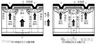 部分元胞的多晶硅栅极与发射极短路,导通期间,栅极两侧的p基区则不会形成导电沟道,于是从集电区注入的空穴无法与电子复合,也会在栅极下方的n-漂移区内形成堆积。