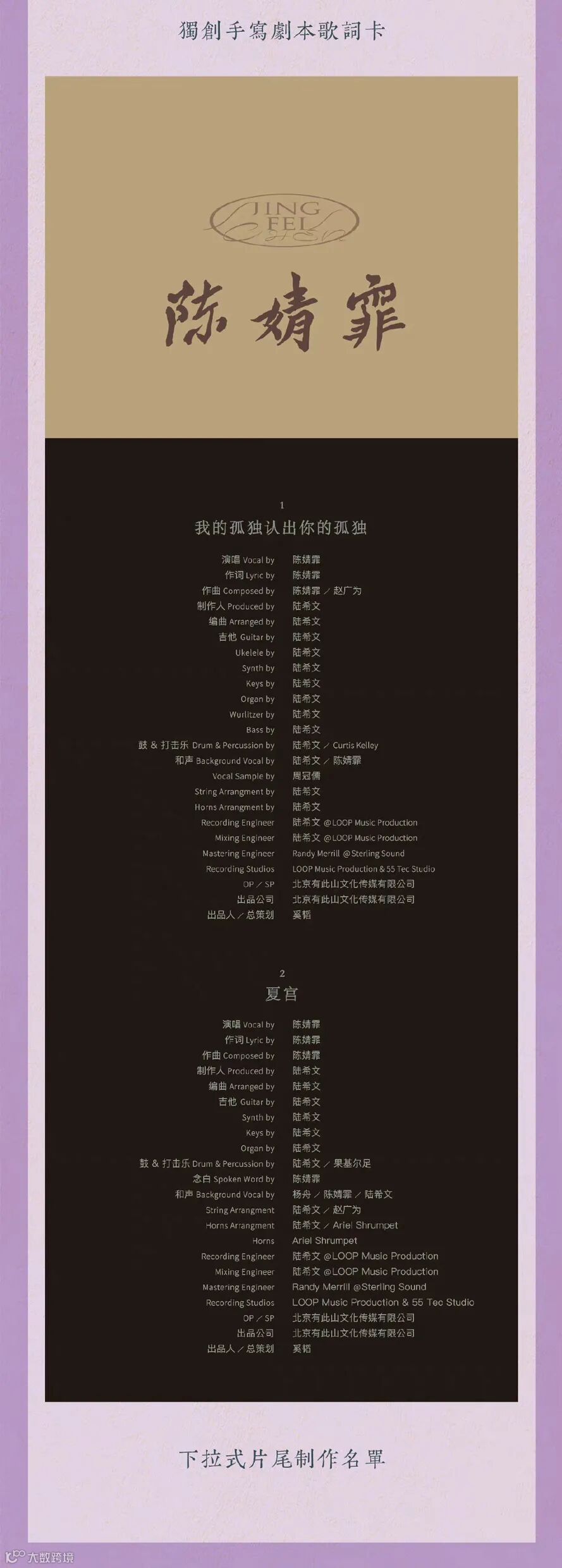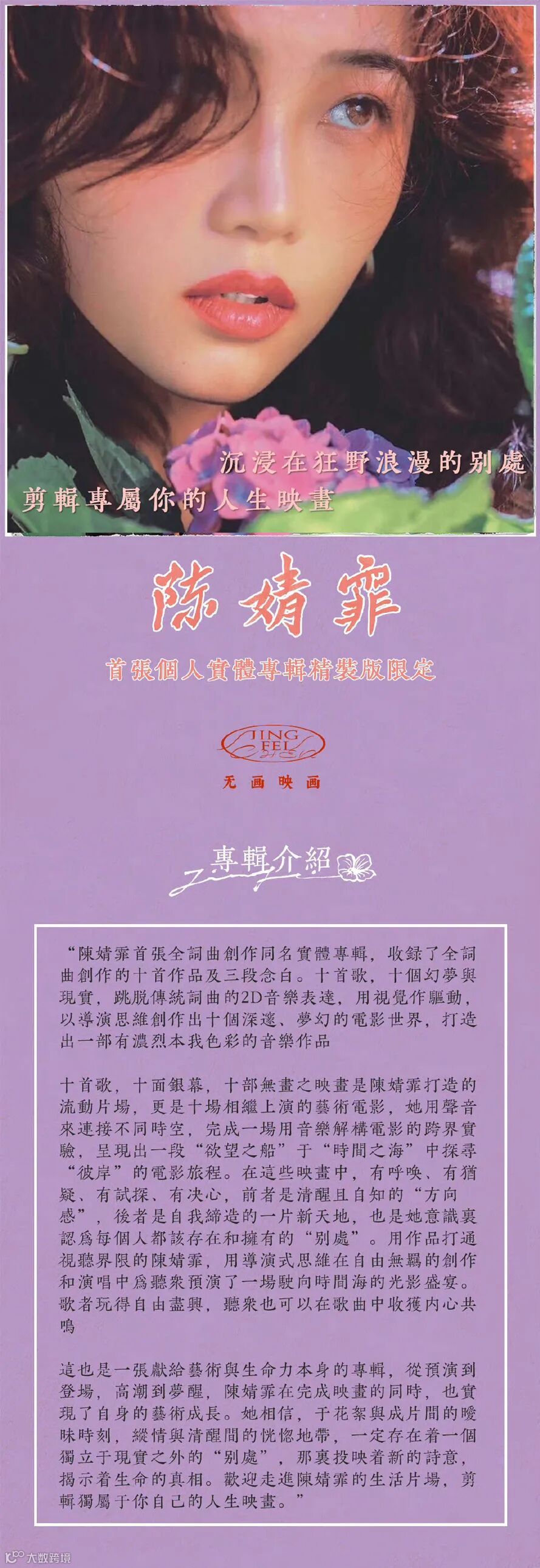 在成为音乐人之前,陈婧霏有很多身份,她是清华大学和伯克利音乐学院的高材生,做过金融,写过剧本,演过话剧,也曾希望成为一名独立导演。成为唱作人后,这些经历都一一体现在她的音乐创作中。对她来说,创作和制作歌的过程跟电影拍摄异曲同工,她一直用导演的思维“拍摄”音乐。她的歌在听觉之外,还有另一层视觉维度;从她的作品中,可以听到、看到视听语言艺术的统一融合。在首张全词曲创作的同名专辑《陈婧霏》中,她用声音来连接不同时空,完成一场用音乐解构电影跨界实验。跳脱传统词+曲的2D音乐表达,她以歌曲为银幕,以声音和器乐为框架,把词句切分成光影,观点和意象交织为载体,用十部“无画之映画”,呈现出“欲望之船”于“时间之海”探寻「彼岸」的电影旅程。十首歌,十个片场,十个幻梦与现实。她相信,于花絮与成片间的暧昧时刻,纵情与清醒间的恍惚地带,过去与未来的交载磁场,一定存在一个独立于现实之外的“别处”,那里投映着新的诗意,揭示着生命的真相。
