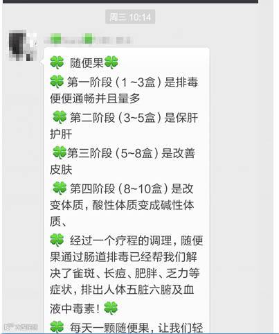 但是,服用一段时间后,赵女士发现,随便果不仅没什么效果,而且还时常拉肚子,被吓坏的她赶紧停用。为详细了解,赵女士还添加了这款零食经销商的微信,微商态度可热情了,时不时给赵女士发些关于“随便果”功能功效的介绍,什么清肠排毒缓解便秘、消痘祛斑醒酒护肝、减脂控重降三高等功能……