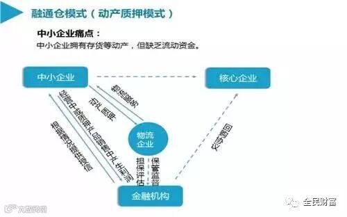 3、动产质押融资:动产质押融资模式中可以不涉及核心企业,但业务涉及对货权的控制和物流监管企业的管理,所以我们仍把其作为供应链金融的模式之一,具体流程如下:急需融资的中小企业利用手头上的货物抵押申请贷款,货物存放在第三方监管公司,由第三方监管公司负责货物的监管,货价的评估以及货物的发放等,一定程度上借鉴监管公司给出的货价评估后金融机构发放贷款,中小企业用运营所得还贷(过程中可以申请拿出监管公司中的部分货物进行售卖),如果中小企业跑路或者丧失还款能力,金融机构也可以提前与核心企业签购协议,希望通过核心企业的回收来解决货物的处理问题。