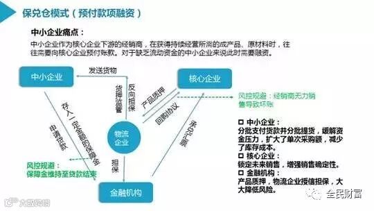 1、应收账款模式:上游的中小企业将核心企业给它的赊账凭证(对中小企业来说是应收账款)转让给金融机构融资从而进行自身的运营,若到还款期限中小企业不能还款,则金融机构可凭应收账款向核心企业收款。那么对于金融机构来说,还款来源相当于从中小企业转为核心企业,即第一还款来源是核心企业,第二还款来源才是中小企业运营所获利润,这就大大降低了贷款风险。在这种模式下,因为核心企业到期必须付款,对它来说付给中小企业和付给金融机构并没有什么差别,而它帮助了中小企业完成融资问题,提高供应链资金统筹效率。