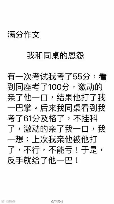 微博网友@小成ICc:小明第一次考试考了100分,小明妈妈很开心,奖了小明一个吻,小明由此开始骄傲自满,第二次考试考 了55分,被妈妈打了一巴掌。小明妈妈要求小明必须考100分,第三次考试考了98分,小明还是挨了一巴掌,自此小明一蹶不振,郁郁寡欢,小明妈妈吓坏了,终于想通了成绩并非最重要的,于是第四次小明被吻。