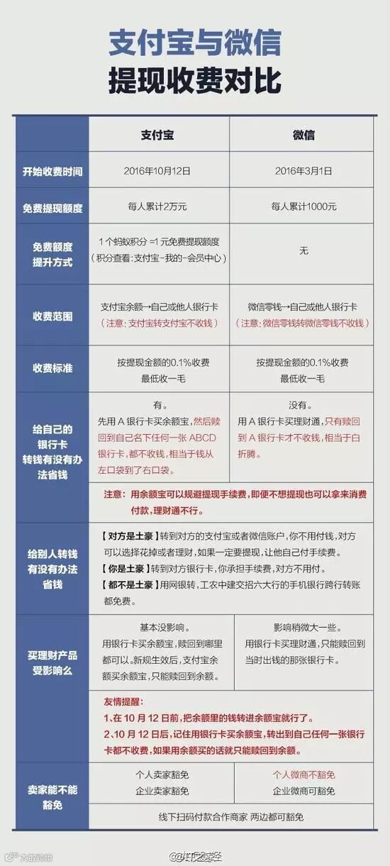 那么,支付宝与微信提现收费之间有哪些具体差别呢?下面是由@央视财经 整理制作的对比图,简单直观地回答了前面的问题。